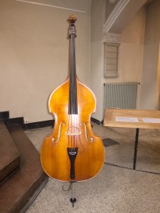 This is the grandfather of the string family. At over 6 feet long, the double bass is the biggest member of the string family, with the longest strings, which allow it to play very low notes. The 6 to 8 double basses of the orchestra are almost always playing the harmony. They are so big that you have to stand up or sit on a very tall stool to play them, and it helps if you have long arms and big hands. Like the cello, the body of the double bass stands on the ground, supported by a metal peg, and the neck rests on your left shoulder. You produce sound just like on a cello, using the left hand to change pitch and the right to move the bow or pluck the string.